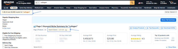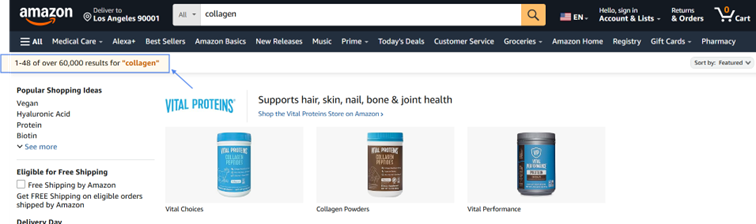 Dòng thông tin này cho thấy Amazon hiển thị 48 sản phẩm đầu tiên trong số hơn 60.000 sản phẩm có liên quan đến từ khóa “collagen“. Điều này có nghĩa là có hơn 60.000 sản phẩm trên Amazon.com có chứa từ khóa “collagen” trong tiêu đề, mô tả hoặc danh sách tính năng,… của sản phẩm.