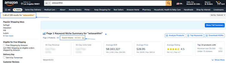 Mặc dù từ khóa “collagen” có lượng tìm kiếm cao gấp 5 lần “astaxanthin” (một chất chống oxy hóa mạnh từ tự nhiên), nhưng số đối thủ cạnh tranh cũng cao hơn đến 100 lần! Điều này cho thấy rằng các Seller mới có thể có cơ hội thành công cao hơn khi lựa chọn thị trường “astaxanthin” thay vì “collagen”.
