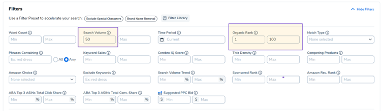 – Search Volume min 50: Loại bỏ các từ khóa có lượng tìm kiếm quá thấp.
