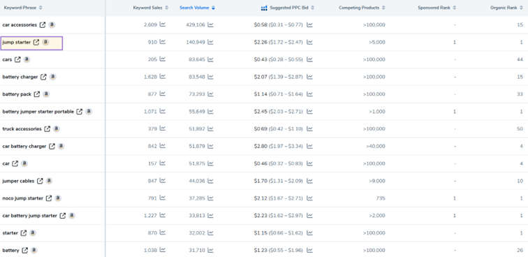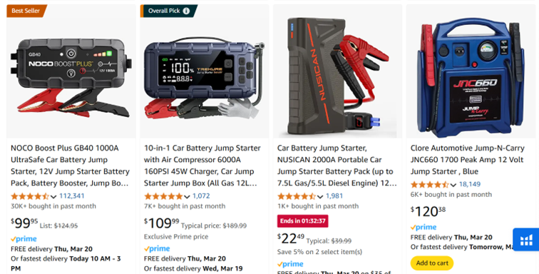 Tuy nhiên, khi kiểm tra từ khóa ‘jump starter’, ta thấy đây là kệ hàng quan trọng nhất cần đưa sản phẩm vào vì các sản phẩm hiển thị giống sản phẩm bạn muốn bán nhất.