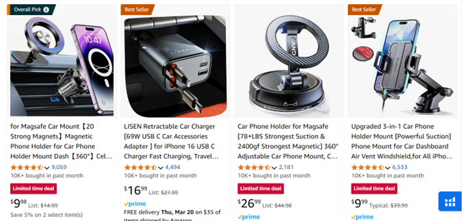 Ví dụ, với từ khóa ‘car accessories’ – cả 10 sản phẩm đầu tiên hiển thị tự nhiên trên Amazon đều không liên quan đến sản phẩm B015TKUPIC: