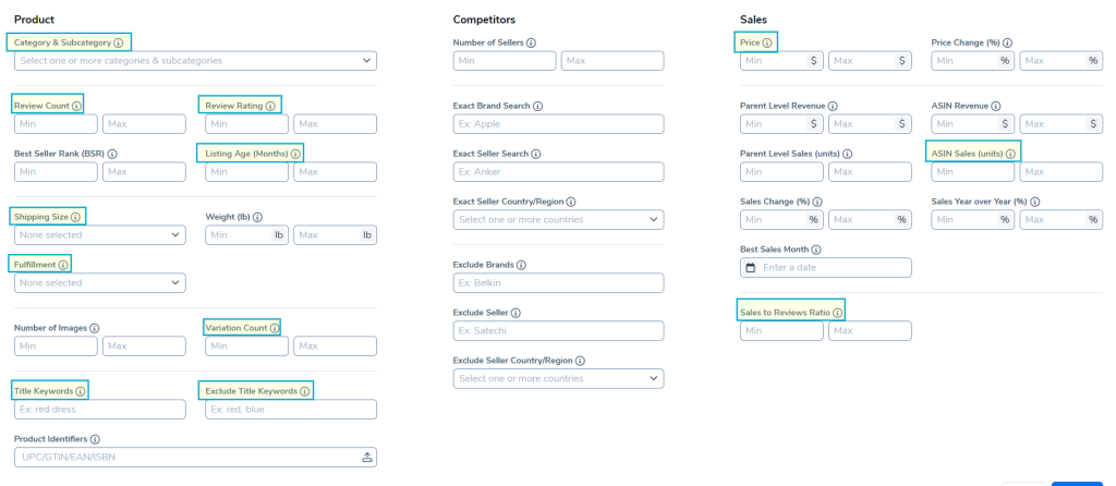 - Khoảng giá bán mong muốn của sản phẩm (ví dụ, nếu bạn đã chọn điều kiện Max Reviews 50, max Listing Age Months 6 thì khoảng giá ở đây là khoảng giá để bán trong thời gian đầu -> tăng giá khi đã có vị trí hiển thị tự nhiên tốt và tích lũy được Reviews)