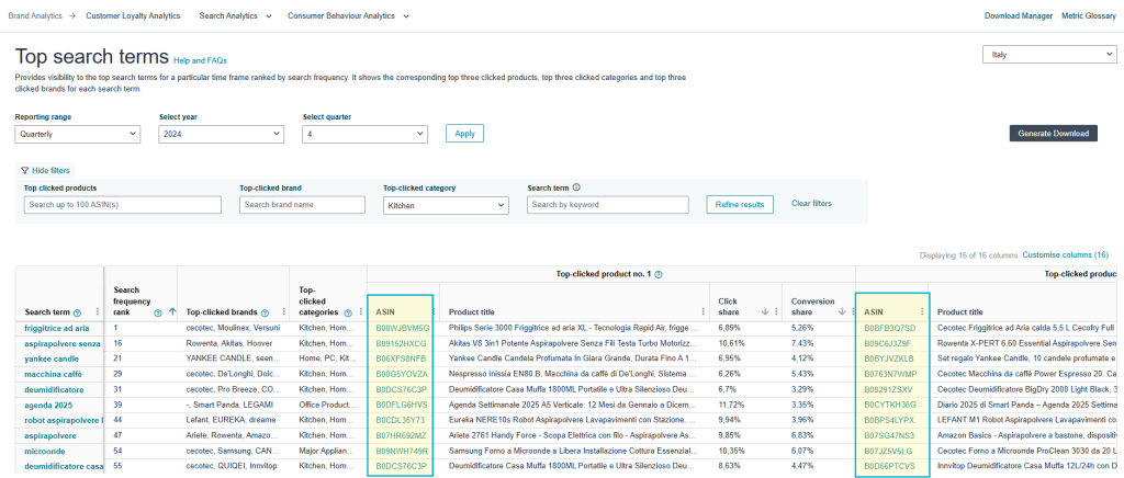 • Trong bảng dữ liệu “Top Search Terms”, nhấn vào các ASIN nằm trong top từ khóa (bỏ qua các từ khóa thương hiệu lớn).
