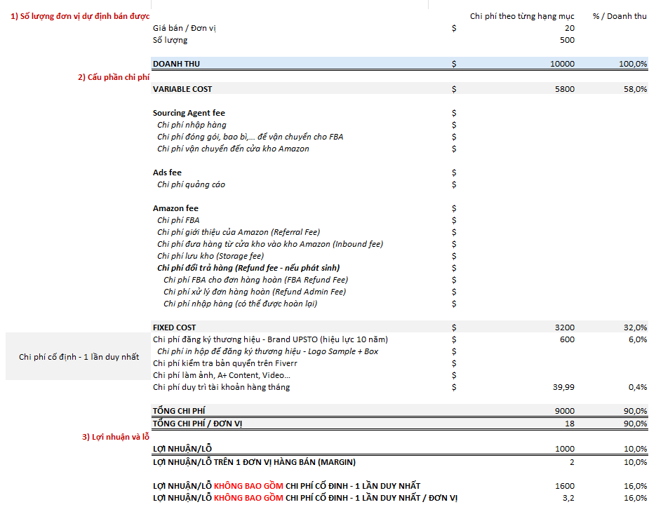 • Tổng chi phí cố định= 3200$ (bao gồm chi phí cố định 1 lần duy nhất như đăng ký thương hiệu, kiểm tra bản quyền, v.v)