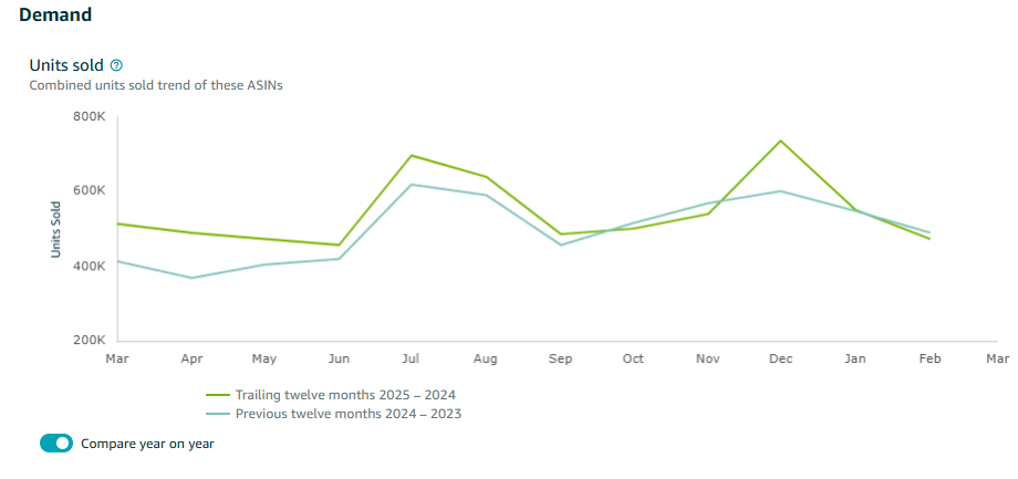 Seller có thể kiểm tra nhanh và so sánh lượng sản phẩm bán ra trong ngách sản phẩm được chọn của năm nay và năm trước. Điều này giúp đánh giá sức mua của khách hàng trong ngách đó trên Amazon nở ra, chững lại hay thu hẹp so với cùng kỳ.
