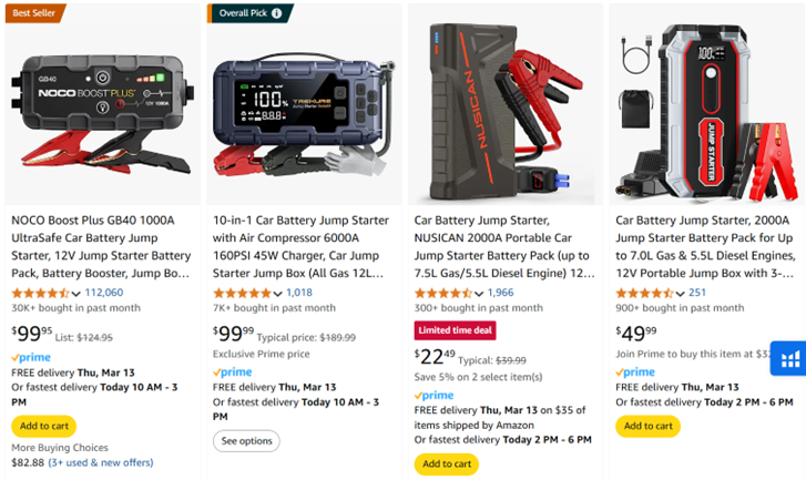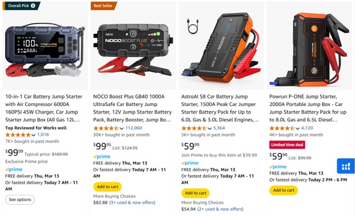 This means that over the last 30 days, there were a total of 2,354 searches for the keyword ‘car battery charger portable’ on Amazon.com. And here are the search results on Amazon: