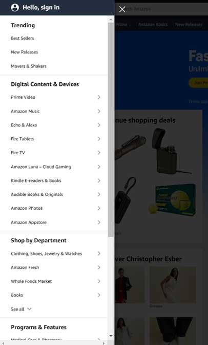 Additionally, customers can search for products by navigating the Category menu below the Amazon logo. However, this method is often more complex because it requires sifting through a vast category system: