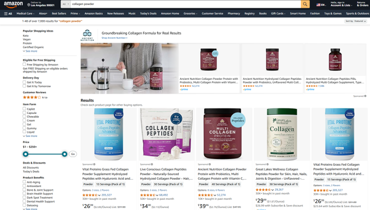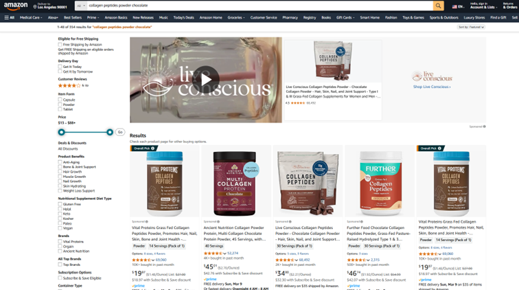 - More specific keyword: “collagen peptides powder chocolate” indicates a more detailed need—the customer wants to buy collagen powder with a chocolate flavor and in peptide form.